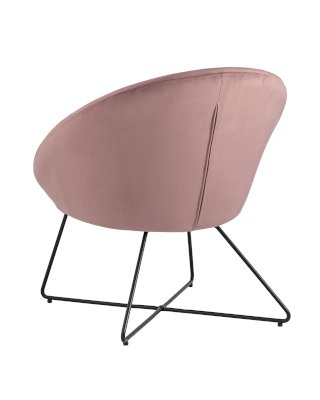 Широкая спинка плавно переходит в удобные подлокотники. Перекрещенные ножки изготовлены из металла и добавляют креслу оригинальности. Для дополнительного комфорта в кресле есть мягкое плотное сиденье. В качестве обивки используется велюр, приятный на ощупь. Металлический каркас добавляет устойчивости и выдерживает нагрузку до 120 кг.