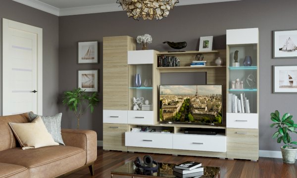 Гостиная "Элиза" с 2-мя ящиками на роликовых направляющих. Опционально возможна установка светодиодной подсветки для стеклополок.