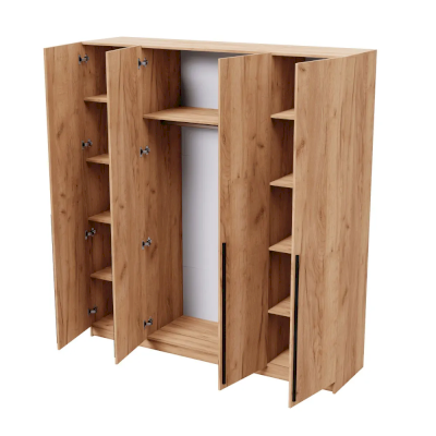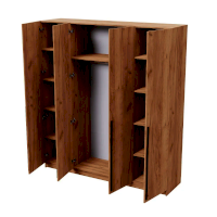 Четырехстворчатый шкаф имеет универсальный вариант для хранения: на боковых полках можно разместить нижнее белье, одежду, постельное белье, а на горизонтальной штанге развесить одежду на вешалках. Сочетание платяного и бельевого отсеков позволяет использовать шкаф в качестве комбинированного.
