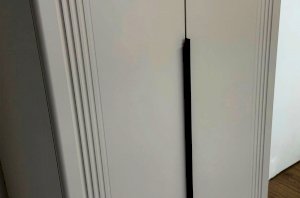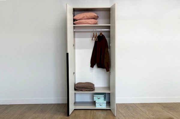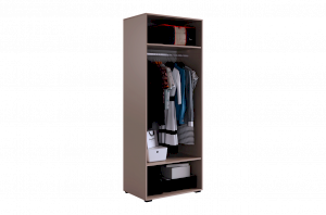 Шкаф оснащён длинными пластиковыми ручками и имеет удобное внутреннее наполнение: две большие полки и одна длинная штанга. Это позволяет рационально использовать пространство и разместить различные типы одежды.