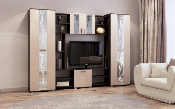 Гостиная "Прага" - это классическая среднегабаритная зальная стенка. В гостиной «Прага» применяются современные декоры, а фасадная часть украшена зеркалами и стеклами с пескоструйным рисунком. Все элементы гостиной устанавливаются на регулируемые ножки-опоры.
