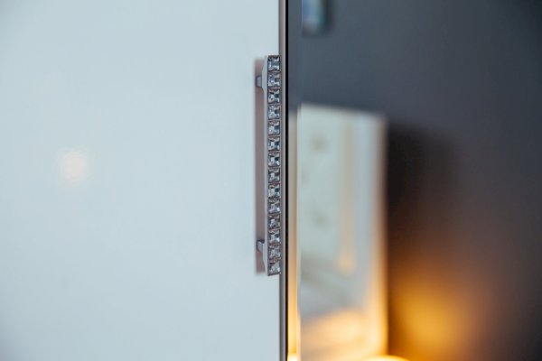 1. Белые глянцевые фасады МДФ с фрезеровкой «Орхидея», украшенные ручками с кристаллами.