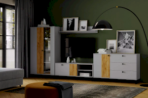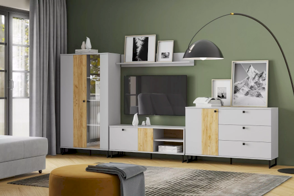 Коллекция БРУНО – это современный дизайн с характером, который отлично впишется в стиль лофт. Цвет платиново-серого и золотого дуба гармонично подчеркнут контрастными элементами – стеклом в витринах, черными ручками и черными металлическими опорами.