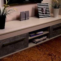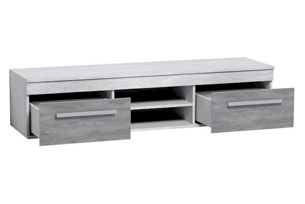 Мебель под ТВ в спокойной сероватой гамме идеально впишется в современный городской интерьер. Фасады ящиков "под бетон" хорошо обыгрывают серебристые ручки из массива дерева. Ящики комплектуются шариковыми направляющими полного выдвижения, что обеспечивает им легкую простую установку и максимальное использование полезной площади ящика. Глубина ящика 40 см, высота 17 см, ширина 51 см. Регулируемые опоры позволяют компенсировать незначительные неровности пола.